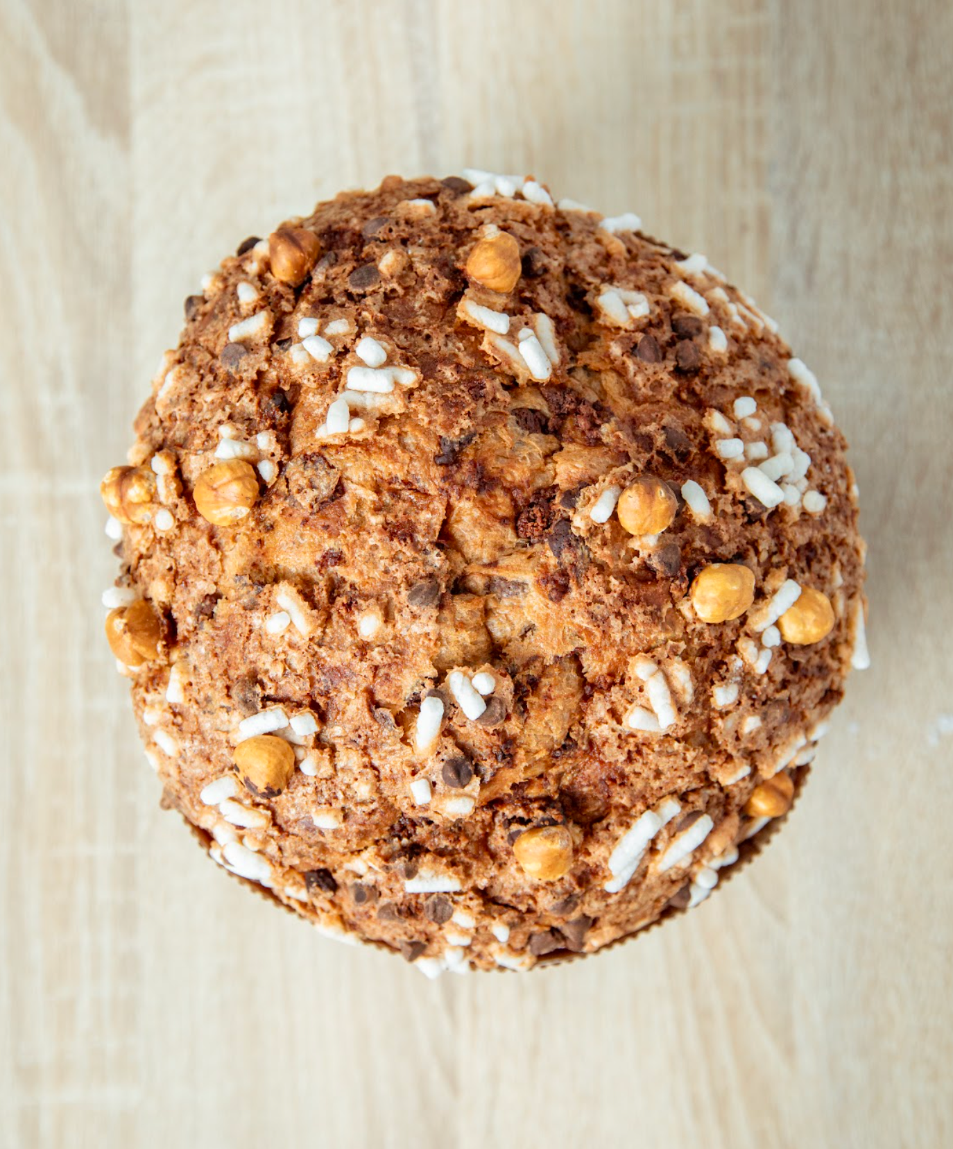 Un delicioso glaseado hecho con almendras, avellanas y cacao cubre la parte superior, atrapando las avellanas, gotitas de chocolate y granos de azúcar.