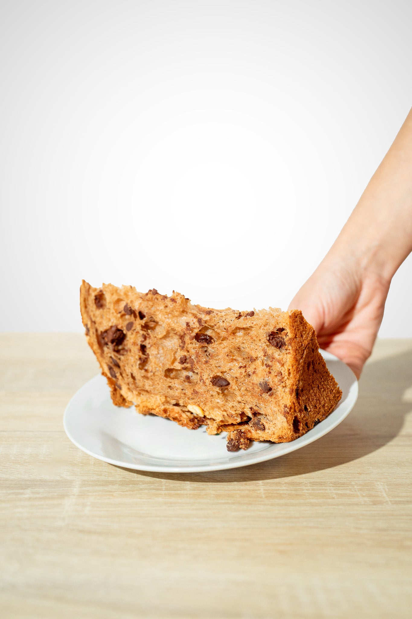 Panettone con mezcla de chocolates, avellanas suave aroma de naranja, cubierto con glaseado de frutos secos y chocolate.